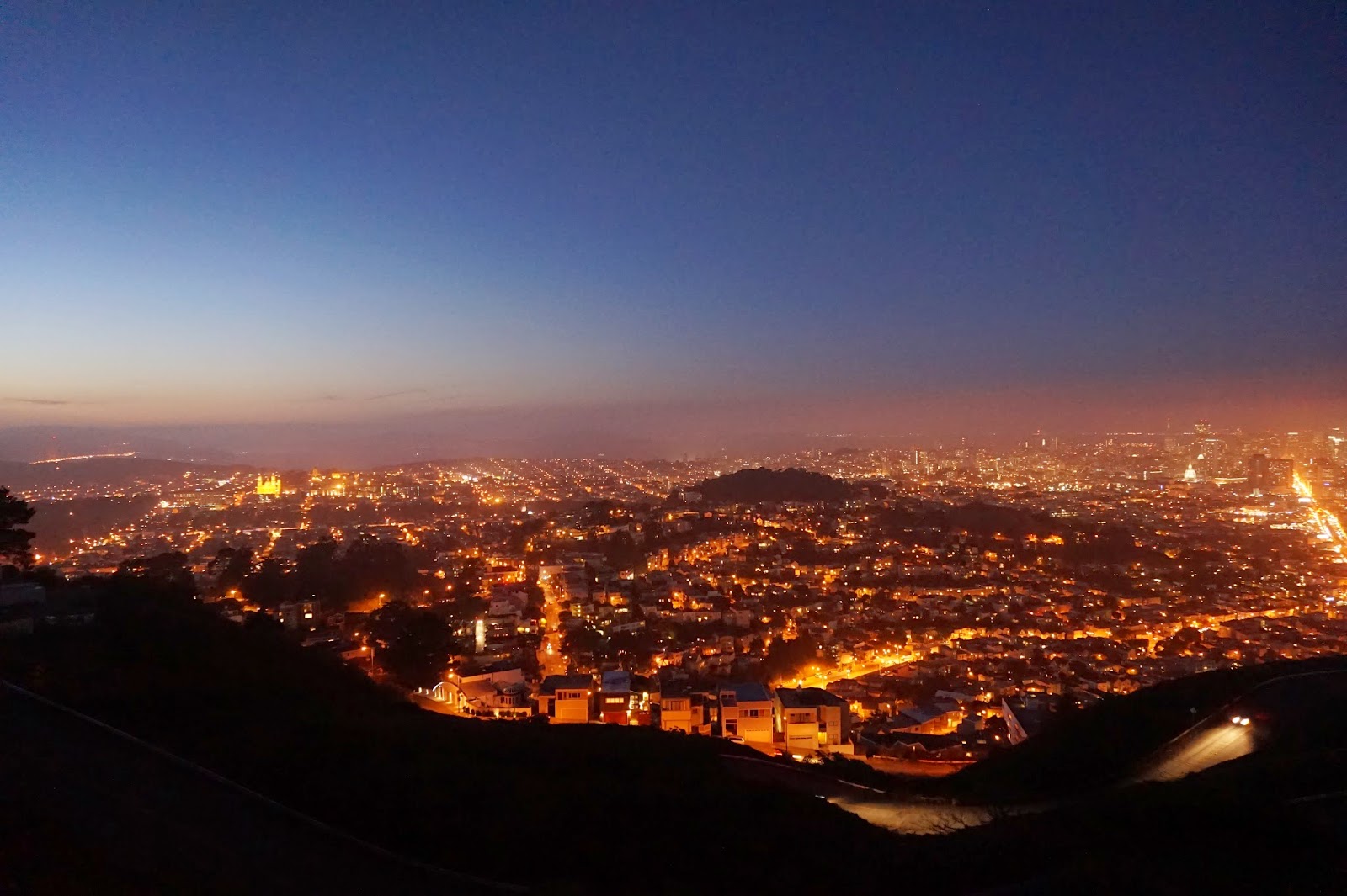 ツインピークスはサンフランシスコ市内西側にある丘の名前で、市内が一望できることで有名です。この写真では左に小さく光っているだけですが、ゴールデンゲートブリッジも見ることが出来ます。特に夜には下の写真のような綺麗な夜景が広がります。